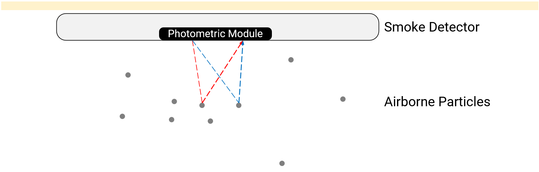 Valor Chamberless smoke detection uses multispectral light scattering to scan into the open room for smoke. Infrared light (invisible to the human eye) checks for the presence of airborne particles and visible light confirms whether the particles are smoke. Because smoke reflects infrared and visible light differently than nuisances like steam, dust, or cooking aerosols, Valor Chamberless only alarms when smoke is present.